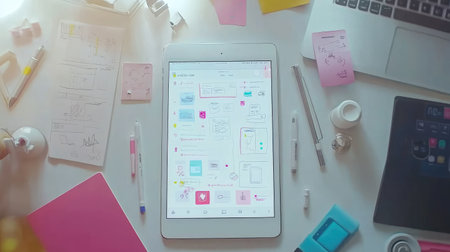A bright and organized workspace featuring a digital tablet surrounded by stationery items. Perfect for showcasing creativity and productivity in modern design.