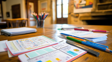 A vibrant and organized workspace featuring various colorful stationery and papers on a rustic wooden table, perfect for creative projects or collaborative work.