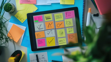 A vibrant workspace during a brainstorming session, featuring colorful sticky notes and design mockups on a wooden table. Ideal for creative processes.