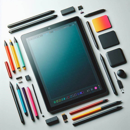 A vibrant creative workspace featuring a digital tablet surrounded by colorful art supplies, illustrating the fusion of digital and traditional artistry.