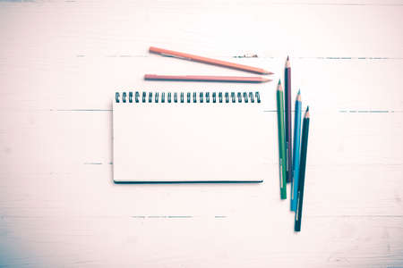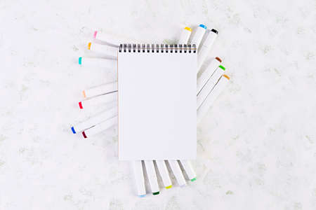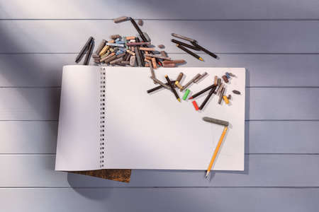 Notebook with white sheets and colored pencils for drawing on white wooden background