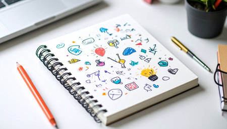 Close-up of a notepad with handwritten ideas and doodles, surrounded by office tools, showcasing the personal process of idea generation and planning.
