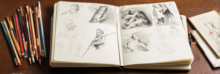 Open sketchbook rests on a wooden table, showcasing various unfinished graphite drawings alongside an array of colored pencils scattered nearby.