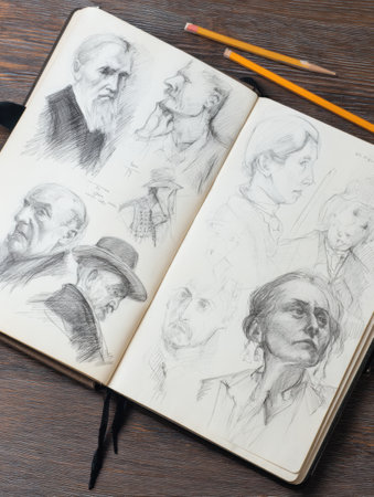 An open sketchbook reveals a collection of unfinished graphite drawings showing multiple portraits in various styles and expressions, reflecting creativity.