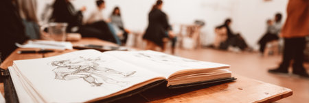 An art class is taking place in a studio where students focus on drawing from a sketchbook placed on a wooden table, showing creativity and learning.