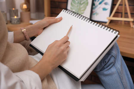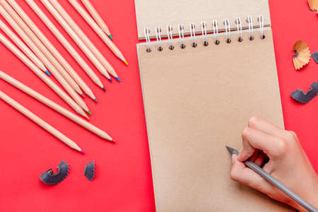 Top view on the hand of woman who draws with colored pencils in sketchbook.