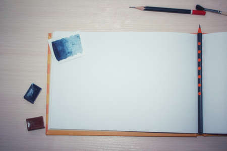 Spread album with white paper, with pencils, paints, mockup for illustration