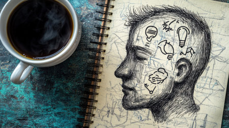 This image features a detailed sketch of a human profile filled with various symbols representing thoughts and ideas, accompanied by a cup of coffee.
