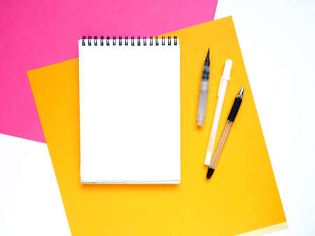 Art table colorful sheets of paper and blank notebook with drawing tools on white background. Top view with copy space