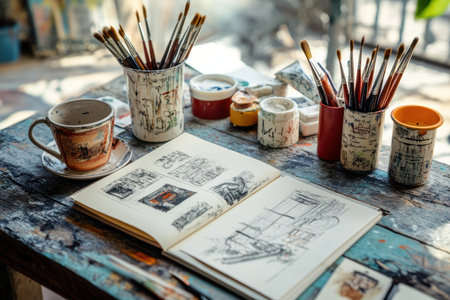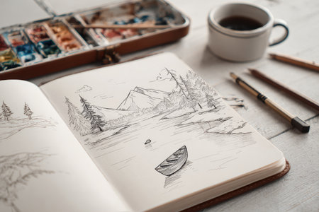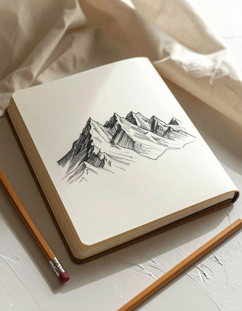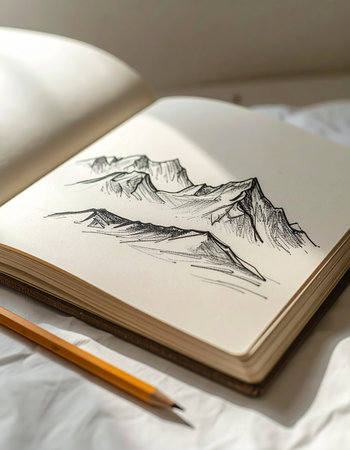 In a quiet, sunlit studio, an artist's notebook lies open, revealing a detailed sketch of a majestic mountain range.