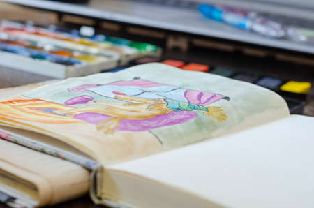 Finished watercolor drawing of dog and watercolor paints with brush. Completely uncolored pencil sketch on paper. Open notebook on brown wooden table. Part of a series. Selective focus.