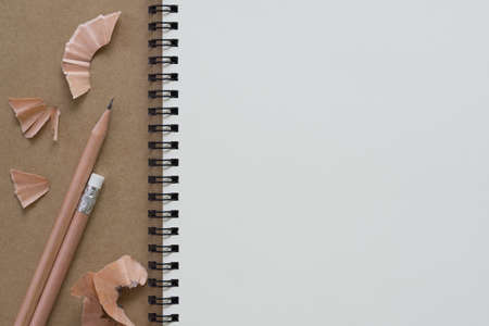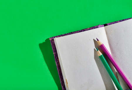 Close up shot of top view of closed spiral blank recycled paper open blank page notebook with vintage retro classic pencils. The blank pages of nature book for your frame with copy space for your text.