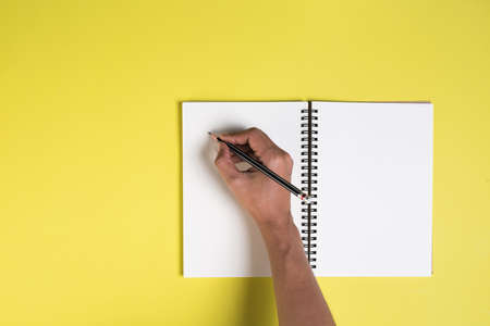 notebook with black paper and with a pencil on a yellow background top view, blank sheet for writing purposes, business concept flat lay