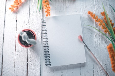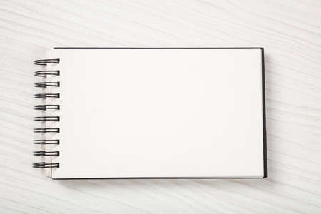 Flat lay composition with blank sketchbook on white wooden table. Space for text