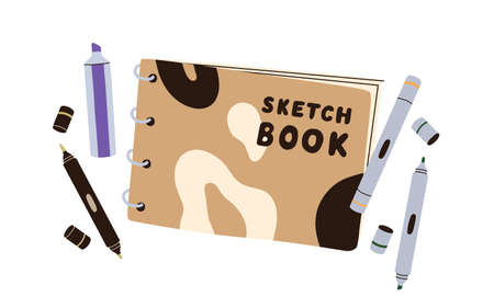 Sketchbook with pencils, liners. Notebook, sketch book for drawing. Notepad for drawn paintings and art supplies. Artists note pad, album. Flat graphic vector illustration isolated on white background