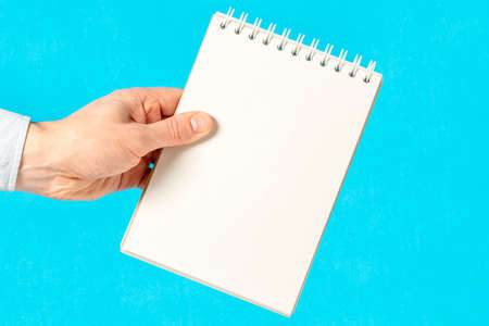 Man hand holding a notebook with blank sheets for writing on a blue background
