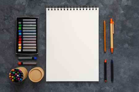Blank notebook mockup pastel pad dark background flat lay. Minimal work space sketchbook notepad template crayons pencils top view. Back to school banner, stationery, art drawing education e-learning.