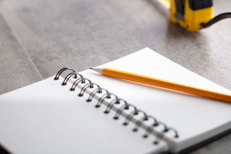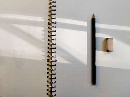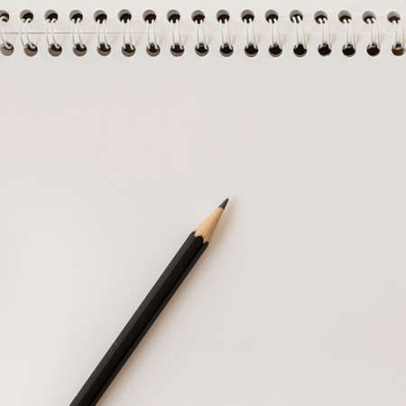 Closeup of spiral notebook and pencil. Blank paper sheet copy space mockup template. Empty space for text.