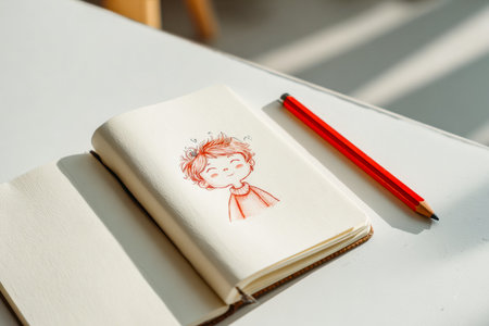 A cheerful child's sketch emerges on paper, brought to life with a bright red pencil, glowing softly on a sunny workspace.