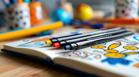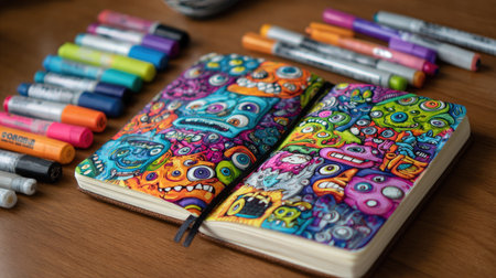 A vibrant notebook adorned with colorful illustrations and whimsical characters, lying on a wooden desk surrounded by colorful markers, showcasing creative potential.