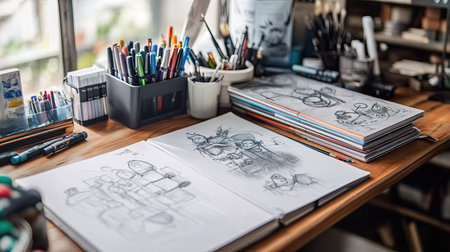 A creative workspace featuring hand-drawn sketches, a set of colored markers, and a stack of sketchbooks on a wooden desk.