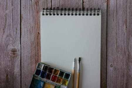 Palette of watercolor paints, blank paper and brushes on wooden background. Artist's workspace. Copy space. Selective focus.