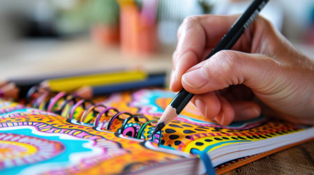 A close-up view of a hand holding a colorful pencil, creating intricate designs in a vibrant coloring book on a wooden table, showcasing artistic creativity.
