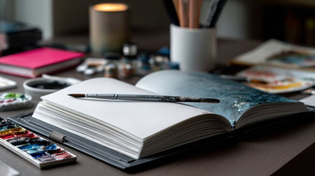 A book is open on a table with a brush and a cup of water. The scene suggests that someone is in the process of painting or drawing