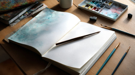 A book is open on a table with a pencil and a set of paintbrushes. The pencil is on the left side of the book, and the paintbrushes are on the right side