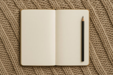 Blank journal opening to empty pages with a black pencil resting on its right page, over a cozy knitted texture