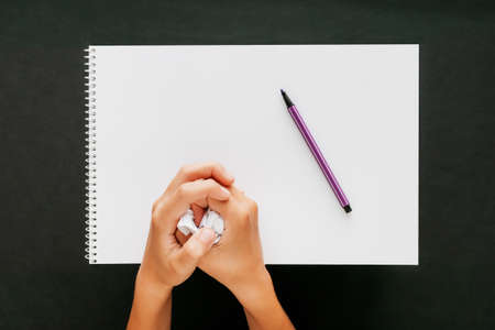 A white desk with an open sketchbook and a woman's hand. Drawing. View from above. Creative desk. Mockup. Panorama