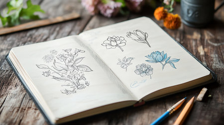 Light sketch line from a pencil on a blank art journal page with floral elements nearby