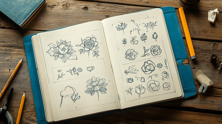 A sketchpad with pencil sketches and doodles scattered across its pages
