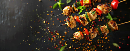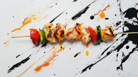 This image showcases grilled chicken skewers adorned with vibrant vegetables against an artistic backdrop, perfect for food enthusiasts and culinary presentations.