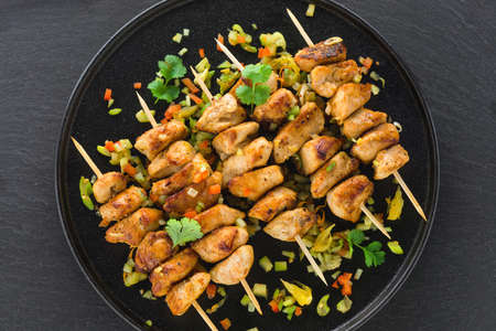 Chicken breasts yakitori grilled on bamboo skewers with spicy fruit and vegetable salsa