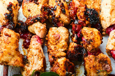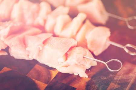 Close up pf delicious chicken breast on wooden skew with fresh vegetables, garlic, paprika fried on mangal barbeque grill