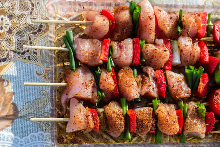 Street fast food festival. Cooking raw kebab closeup. BBQ fresh beef chop slices. Traditional eastern dish, shish kebab. Grill on charcoal and flame, picnic.