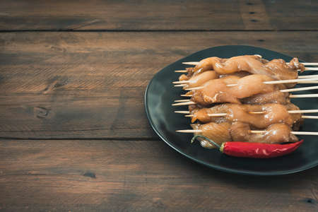 Plate with raw chicken skewers and red chili on dark wood. Copy space.