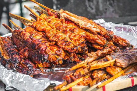 Thai street vendor sells grilled chicken meat at street food market in island Koh Phangan, Thailand. Close up fried chicken butts