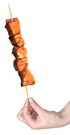 The man's right hand was picking up the pork skewers that were placed on the grill. A white smoke rose.