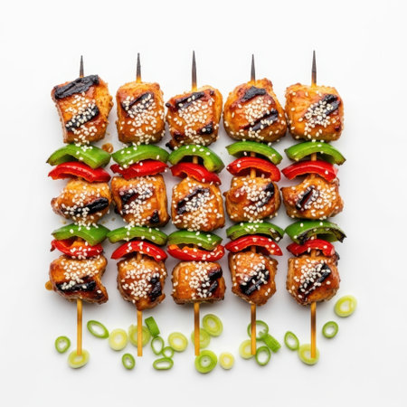 Enjoy a vibrant array of grilled meat and vegetable skewers sizzling over an open flame, perfect for outdoor gatherings or summer picnics.