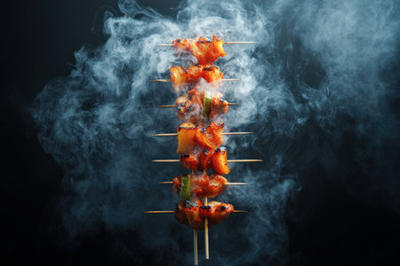 Food photography of meat skewers (shish kebabs) on sticks, with smoke in the background, against a dark background, using studio lighting, for a food advertisement. --ar 3:2 --v 6.1 Job ID: 1af82105-2ab7-4105-9254-5841514d3b36