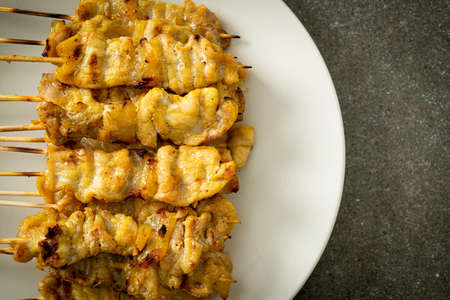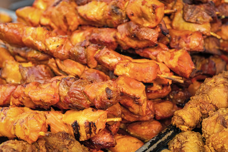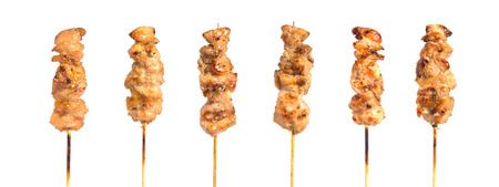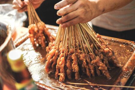 Fresh made chicken satay skewer. Traditional thai cuisine on market.