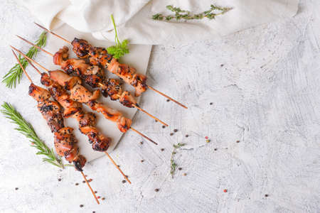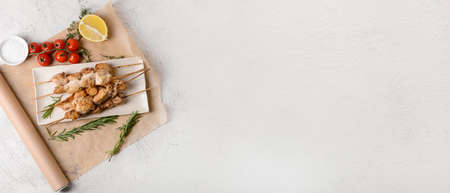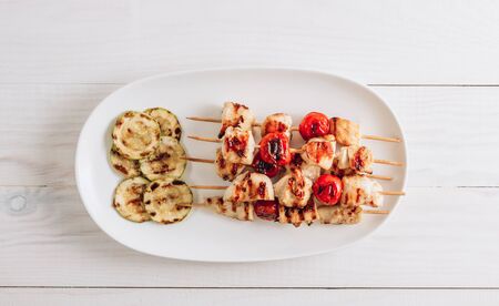 Grilled chicken skewers with cherry tomatoes on a white plate. White wooden table. Top view. Minimal concept