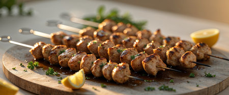 Delicious grilled skewers served with a rich sauce, garnished with fresh herbs. Perfect for summer gatherings and outdoor barbecues with friends.