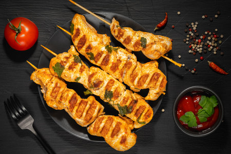 Chicken kebab skewers with grilled vegetables on a black metal tray. Top view with copy space.