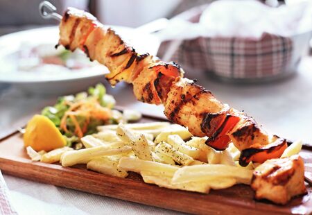 traditional greek souvlaki with chicken and potatoes - greek kontosouvli - greek cuisine