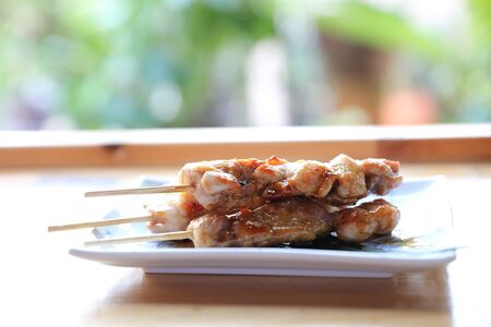 Thai food. Grilled meat balls. Pork balls put wood stick top with sauce on wood.