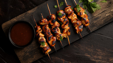 A wooden cutting board displaying tasty chicken skewers ready to be grilled or served, Grilled teriyaki chicken skewers, AI Generated
