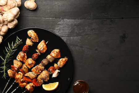 Kebabs - grilled meat skewers, shish kebab on black wooden background